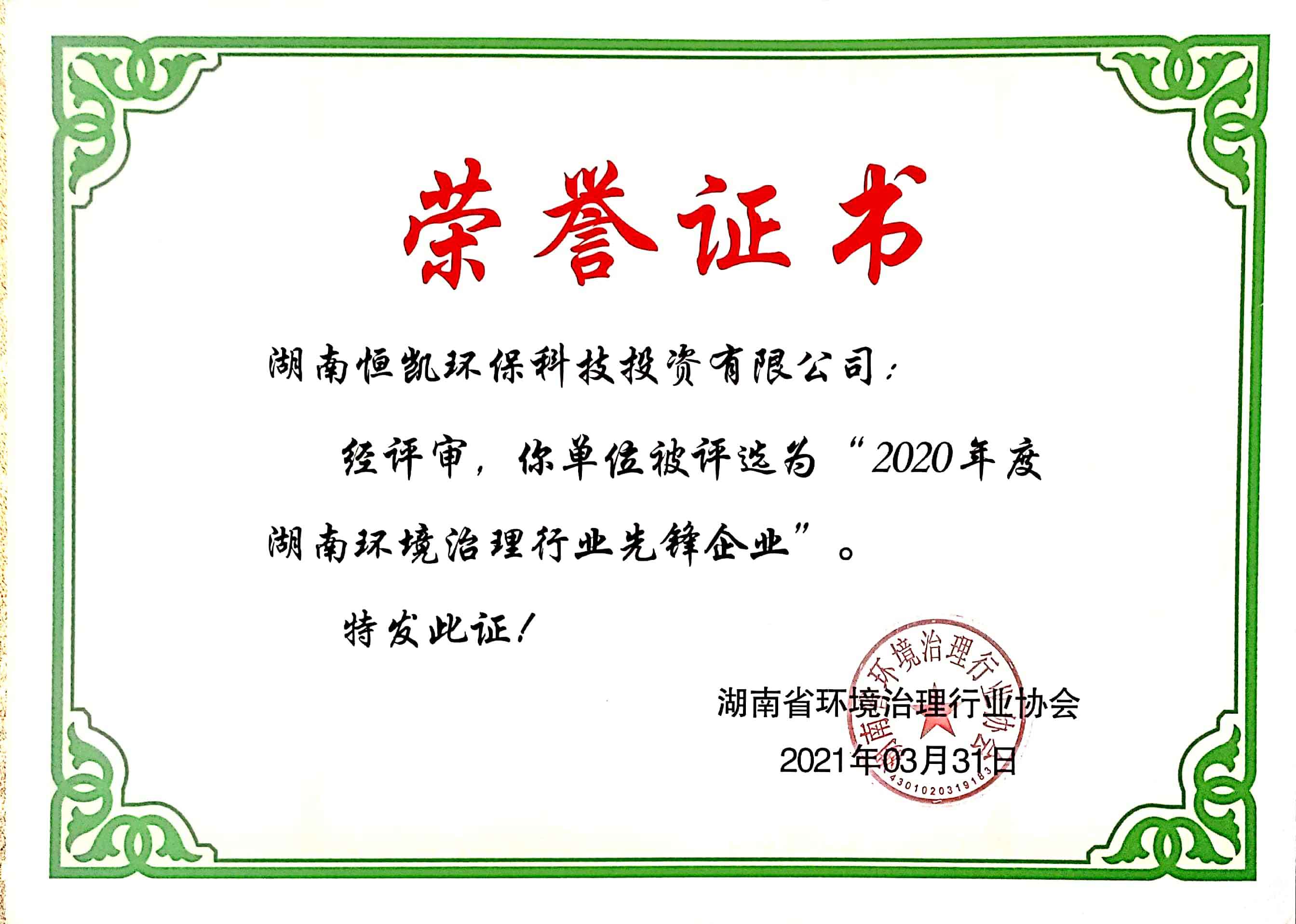 公司動(dòng)態(tài)︱恒凱環(huán)保榮獲2020年度湖南環(huán)境治理行業(yè)先鋒企業(yè)